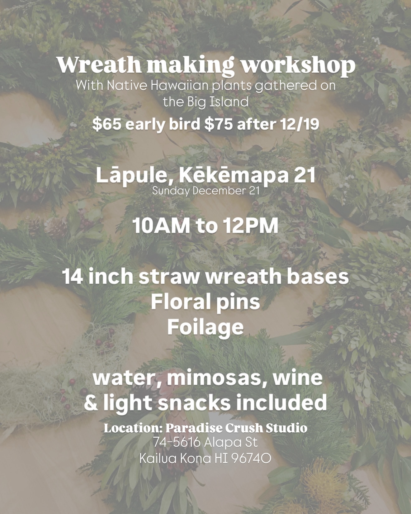 Come alone or bring your friends. This workshop is also the perfect gift for your loved ones who appreciate crafting and learning new skills. E Hele kākou! and have some fun with us creating a beautiful wreath you and your loved ones